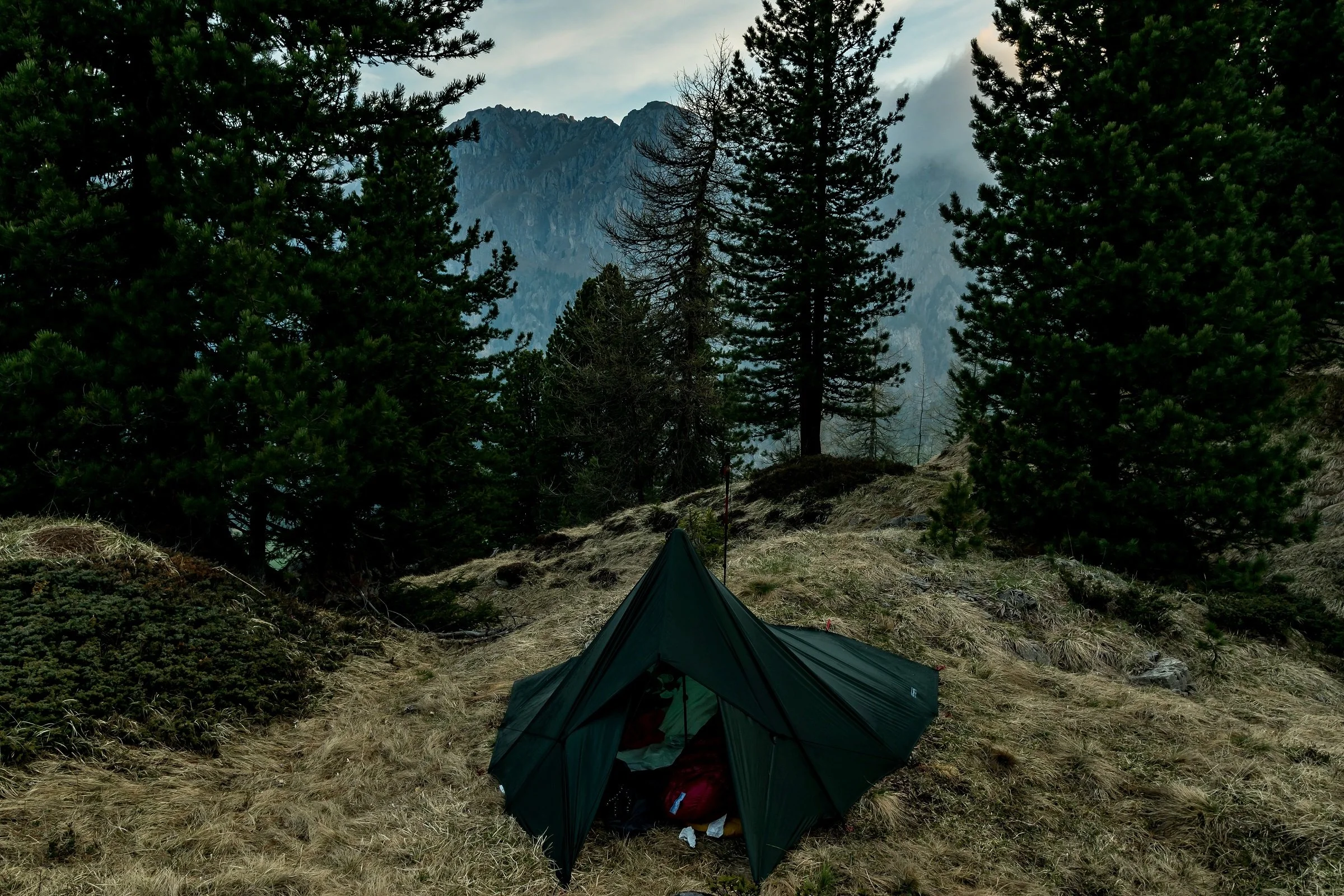 These rules of camping put me in a bit of a dilemma, especially during summer hiking season. As I mentioned earlier, cowboy camping for a single rest pause (overnight bivouac without a structure/tent) is not illegal but still frowned on by many park rangers in the summer months when the huts are open and by Jagers in late fall during hunting season. When the huts close for the season most rangers close their eyes even to tents in the wild unless one builds a fire. Another strict illegal act is building a fire of any kind, especially if the fire is within 100 meters of a forested area. This violation can even be construed by some overzealous rangers as using a simple gas flame of your portable stove to heat up a cup of coffee. So to enjoy my thrill of wide-open spaces without the crowds, I push these very grey camping laws to their limits. I’ve resorted to stealth camping with a hammock and tarp system. It’s possible to use my hammock system in trees in a stealth mode (technically illegal) or as a ground bivy (legal) above the tree line during long treks across the Alps when a hut is either unavailable or undesirable.